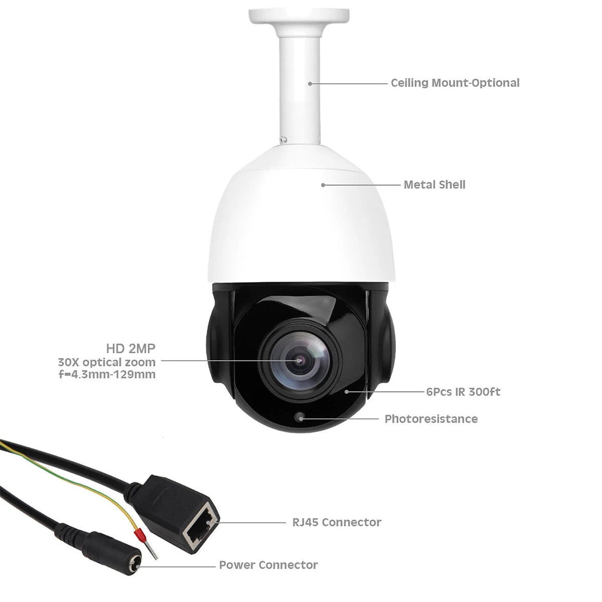 Pan-tilt-zoom camera support onvif 2.4 / P2P / H.265 , with endless 360°pan & 90°tilt & 30x optical zoom, no blind spots left, commercial grade surveillance camera; Rotation Speed: Horizontal 60°/S; Vertical 45°/S. Support two points ; Supports preset point; Rotational speed can be adjusted